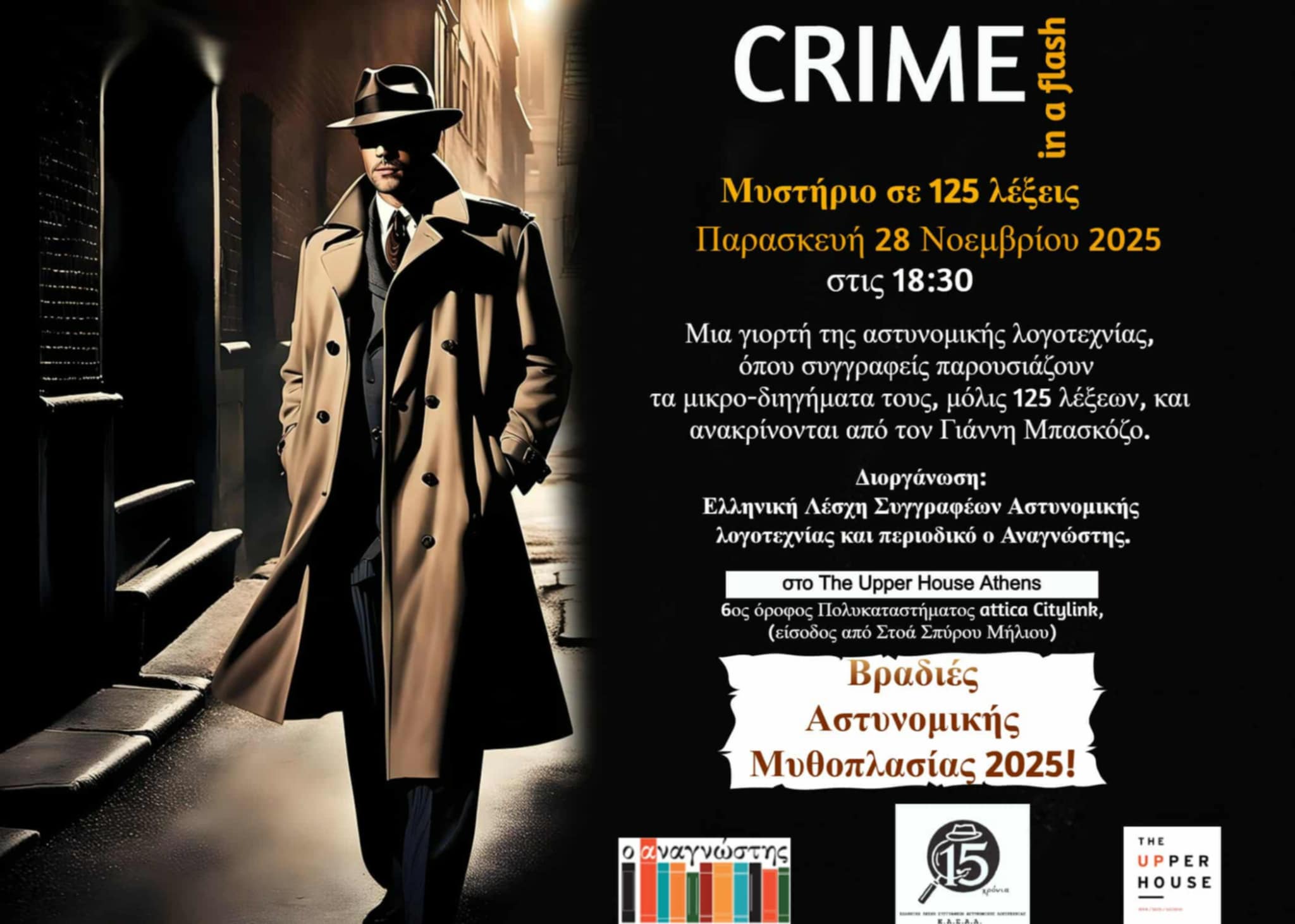 Στείλτε τις συμμετοχές σας στο Αυτή η διεύθυνση ηλεκτρονικού ταχυδρομείου προστατεύεται από τους αυτοματισμούς αποστολέων ανεπιθύμητων μηνυμάτων. Χρειάζεται να ενεργοποιήσετε τη JavaScript για να μπορέσετε να τη δείτε. μέχρι τις 15 Νοεμβρίου και ελάτε στη γιορτή που διοργανώνουμε, στις 28 Νοεμβρίου 2025 στις 18:30, στο The UpperHouse Athens, στον 6ο όροφο του Attica Citylink στο Σύνταγμα (είσοδος από Στοά Σπύρου Μήλιου) να παρουσιάσετε το μικροδιήγημά σας στο πλαίσιο των ετήσιων Bραδιών Αστυνομικής Mυθοπλασίας της ΕΛΣΑΛ από την Παρασκευή 28 μέχρι την Κυριακή 30 Νοεμβρίου 2025.