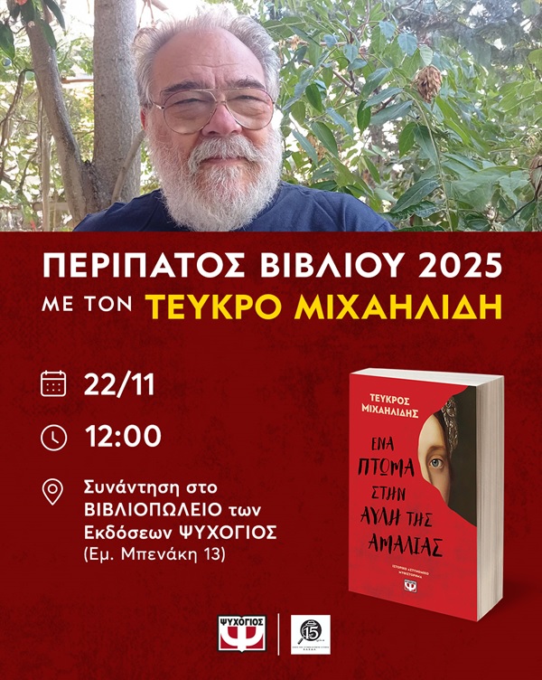 Στo πλαίσιo των εκδηλώσεων «Βραδιές αστυνομικής μυθοπλασίας», η Ελληνική Λέσχη Συγγραφέων Αστυνομικής Λογοτεχνίας (ΕΛΣΑΛ) οργανώνει το Σάββατο 22 Νοεμβρίου, από τις 12:00 έως τις 14:00, έναν περίπατο στην Αθήνα του 1850, με οδηγό το αστυνομικό μυθιστόρημα του Τεύκρου Μιχαηλίδη «Ένα πτώμα στην αυλή της Αμαλίας» (εκδόσεις Ψυχογιός).