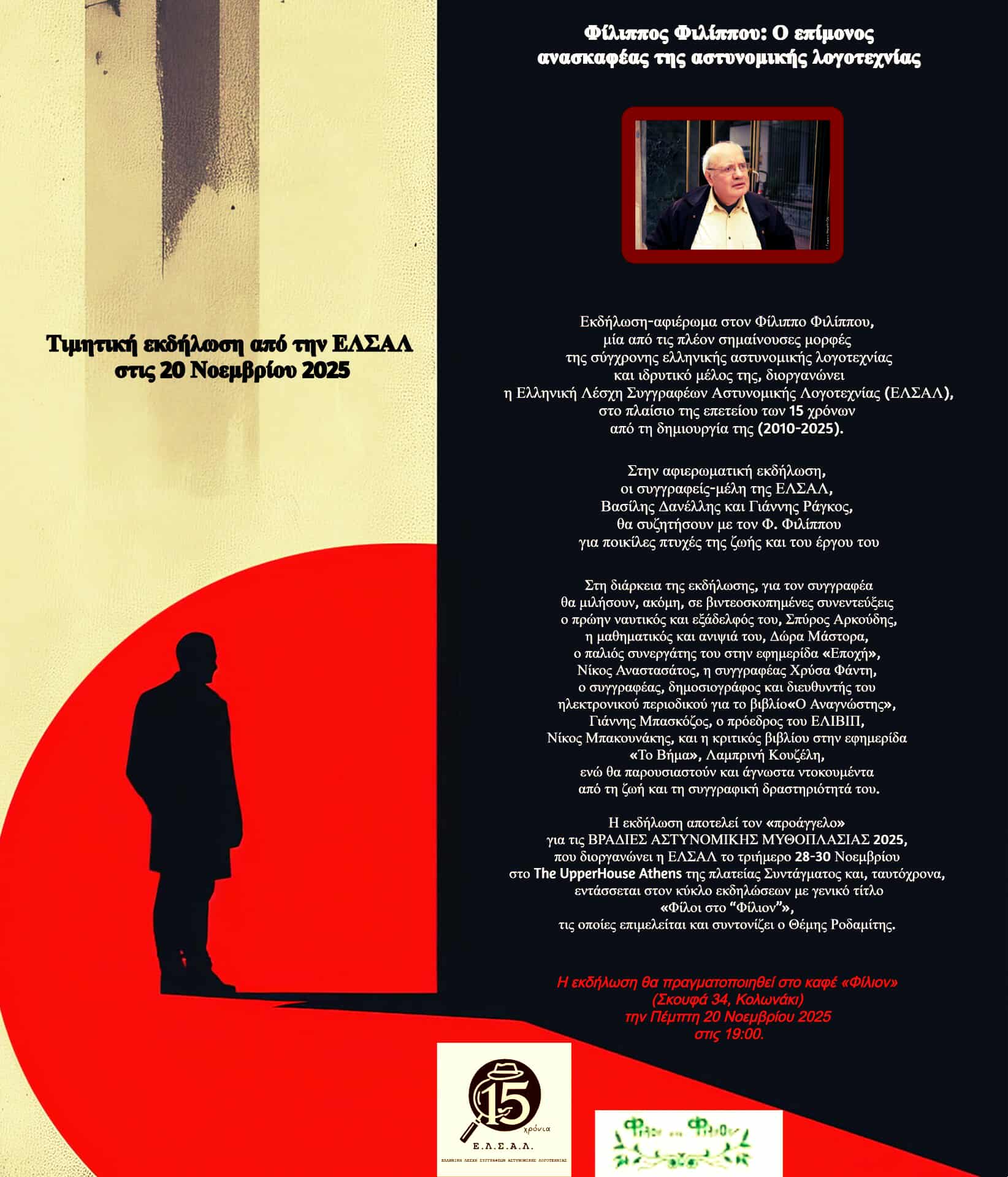 Εκδήλωση-αφιέρωμα στον Φίλιππο Φιλίππου, μία από τις πλέον σημαίνουσες μορφές της σύγχρονης ελληνικής αστυνομικής λογοτεχνίας και ιδρυτικό μέλος της, διοργανώνει η Ελληνική Λέσχη Συγγραφέων Αστυνομικής Λογοτεχνίας (ΕΛΣΑΛ), στο πλαίσιο της επετείου των 15 χρόνων από τη δημιουργία της (2010-2025).
